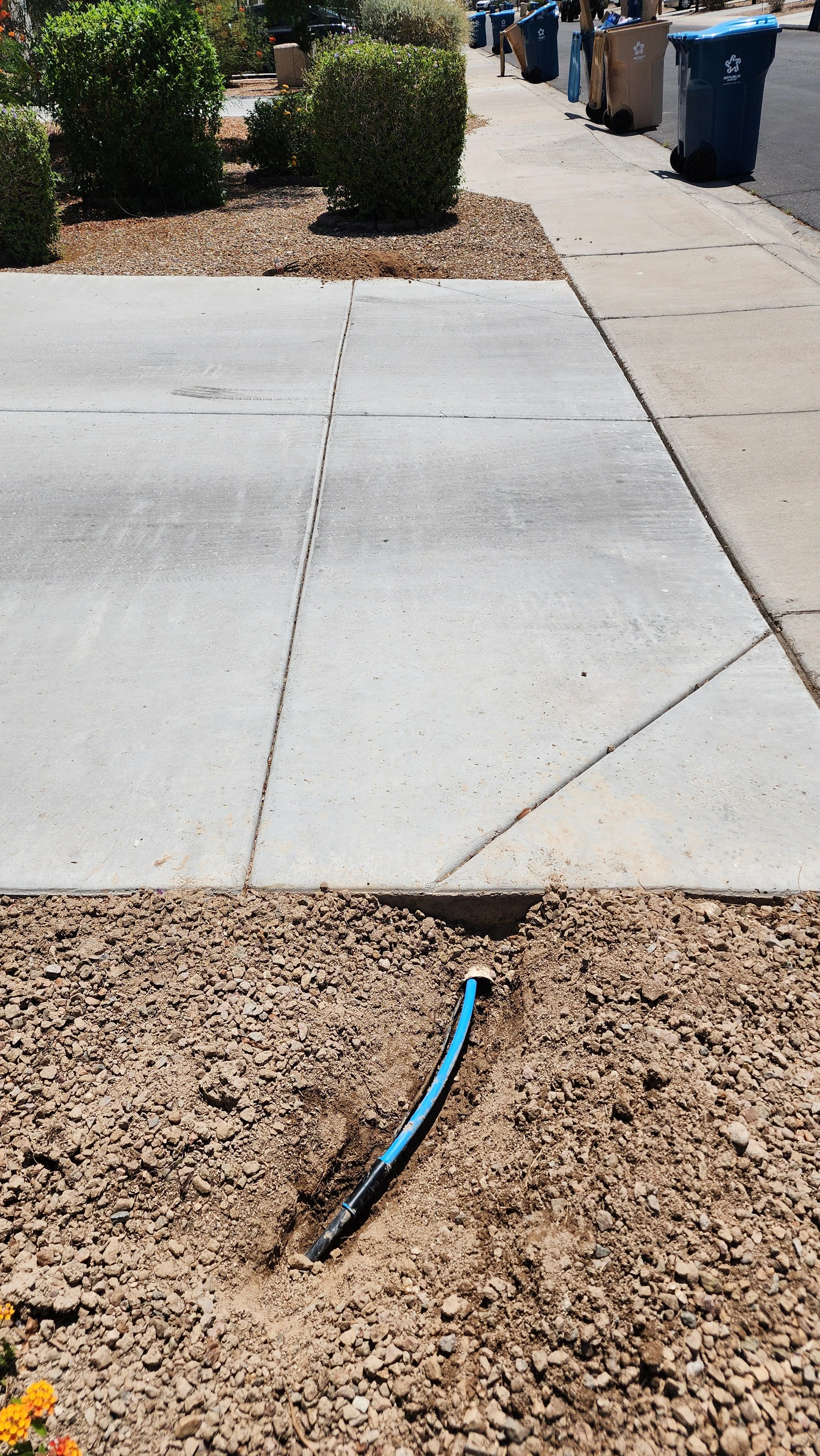 .710” Virgin Poly replacement for old poly tubing. 1” PVC sleeves added under sidewalk where no sleeves were present (and the old poly tubing rubbed continuously against the bottom of the concrete and created leaks)